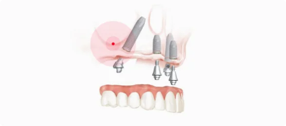 Для восстановления зубного ряда на одной челюсти используем всего четыре имплантата. Два устанавливаем вертикально в передней части челюсти. Ещё два — под углом в боковом отделе, в местах с наибольшим объёмом костной ткани — это даёт протезу надёжную опору. После установки имплантатов фиксируем несъёмный протез